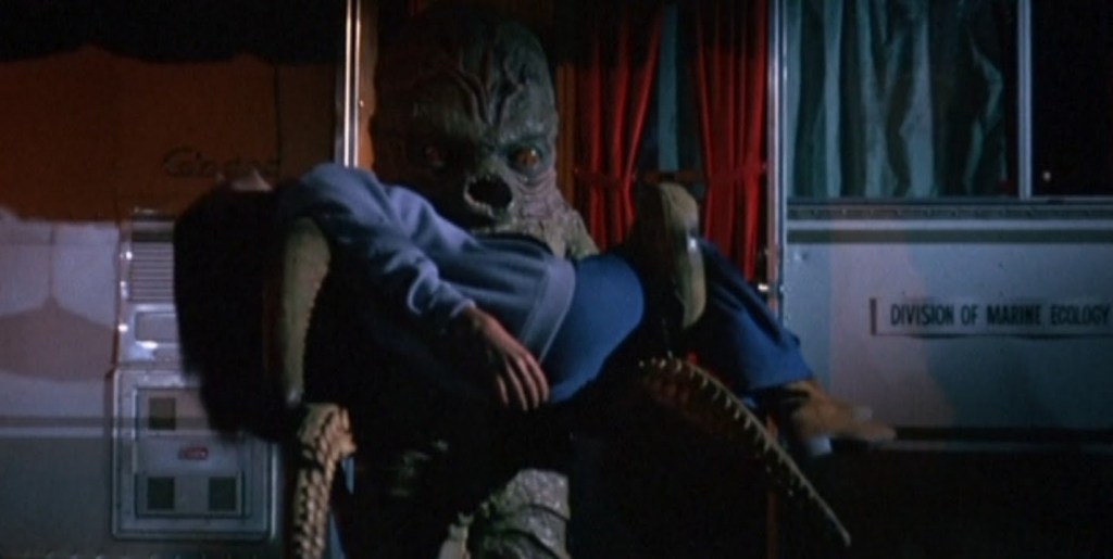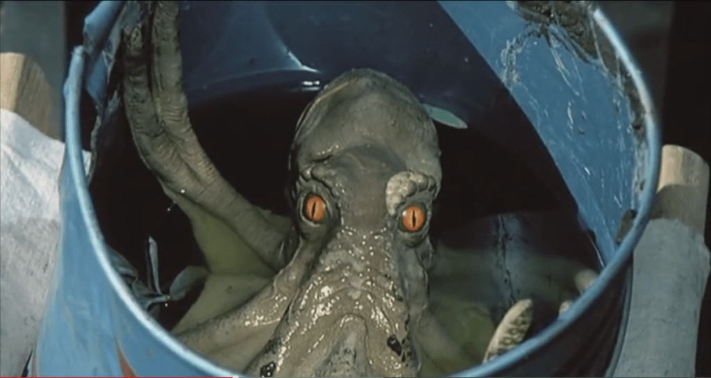 Rick Baker may win 1,000s of Academy Awards from now ’til Doomsday for his make-up special effects, but he will NEVER live down this shaggy skeleton in his fx closet – although he moost share the ‘credit’ with Doug Bestwick. Poor Octo is one of the moost uncowvincing monsters in film history; his pathetic shamblings evoke moore sighs than actual laughs because Director Harry Essex (who wrote the screenplay for Creature from the Black Lagoon) really thought the sight of a guy in a rubber octopus suit walking about on land would be scary. Ahh, to be that naive again…Armed with eyes that never blink, a mouth that never closes, and arms which are tied suspended together by wire, poor Octo is a slow, silly, classic stinky moovie shambling monster gone horribly, horribly wrong. Well, Rick, we all have to start from somewhere…