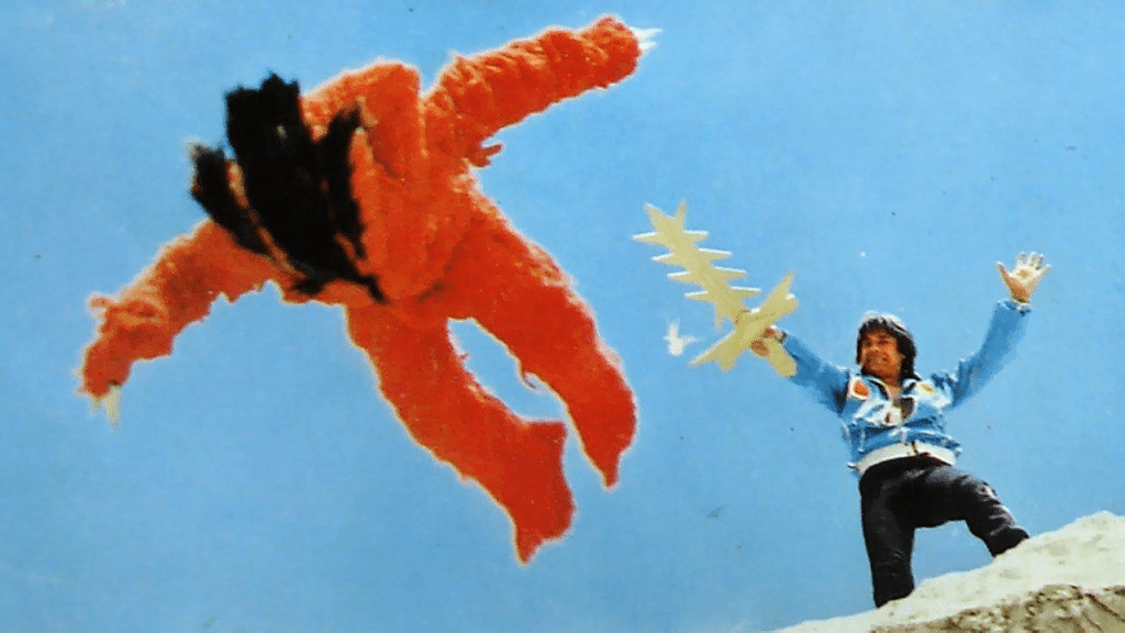 So, a couple of he-man Turkish fellahs get caught up in about 3 minutes of Star Wars footage liberally stolen from the original film, then crash land on a barbaric planet (looking suspiciously like SW Turkey), and proceed to fight an evil sorcerer wearing a hat of spikes cowmanding an army of poorly costumed, day-glo furry critters, using what has to be the moost hopelessly over-designed ‘sword’ ever pieced together from particleboard. There is much jumping and hopping about, rocks are slapped repeatedly in impressive displays of Turkish machismo, and cheap silly fx go off at random just because. Maybe it was lost in translation?? Udder random bits of footage stolen include scenes from The Magic Sword (1962), and moosic taken directly from Indiana Jones. Yer jaws are gonna hit the floor on this one, folks! HURRAYYYYYYY!!!!!!