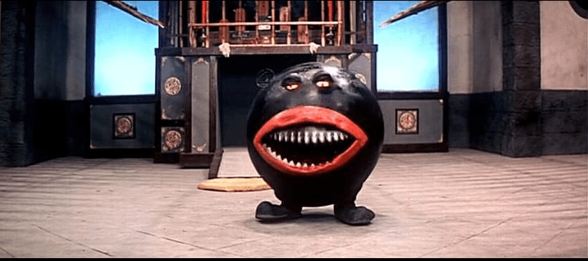 So, poor Ratface (who drives a foot-pedaled rat mobile!) is drunk, as usual, and damages his brother’s temple statue – and since his brother is the head priest, he orders Ratface to…ummmm…find a ‘Cherry Boy’ as on offering to the gods, not as a sacrifice, but to do some odd little dance to appease the gods, you know, as you do. So, off he goes on an epic adventure which leads to, among udder things, the aforementioned Cherry Boy (after auditioning a few children, some of which pull their pants down for him!!!), Granny (a Taoist witch, played by the same actor as Ratface, but with a deep voice), Old Devil/Master Ruthless (the villain of the moovie), his henchmen, including a flying scarf-wielding Princess/Starry Devil, Turtle Man and Fatty, a host of ghosts, goofs, and the infamous Watermelon Monster – plus a whole lotta chop socky action that kind of gets buried because yer spending so mooch time laughing at the wild antics you see on screen!