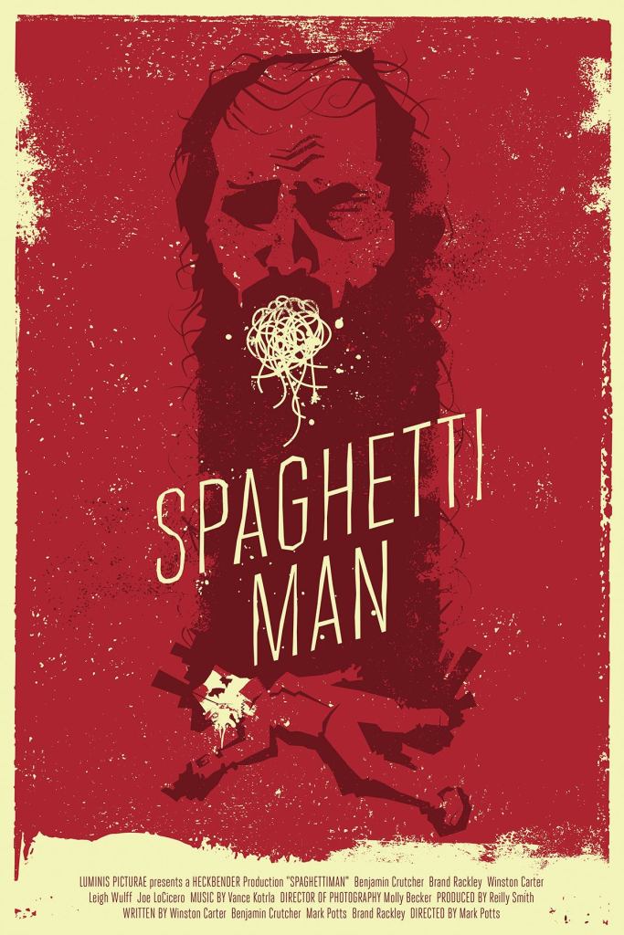 So, is a fun, funny moovie with some witty jokes, some decent fight choreography, and a lot of very good performances. Clark/Spaghettiman is played by Benjamin Crutcher , an actor who has done moostly shorts acting, appearing in such small films as Ninja Valentine (2013) and Shitting Shoes: an Ode to Pooping at Work (2013). Clearly he possesses the same wacky sense of humor as Mark Potts, and they have definitely worked together on udder projects. Dale/Shadowman is played by Winston Carter, Katie is played by Leigh Wulff, and Anthony Banner is played by Brand Rackley. Rackley, Carter and Crutcher also helped write the script. Potts also served as editor. According to IMDB 45 pounds of real spaghetti was cooked and used as FX for this production – very tasty!